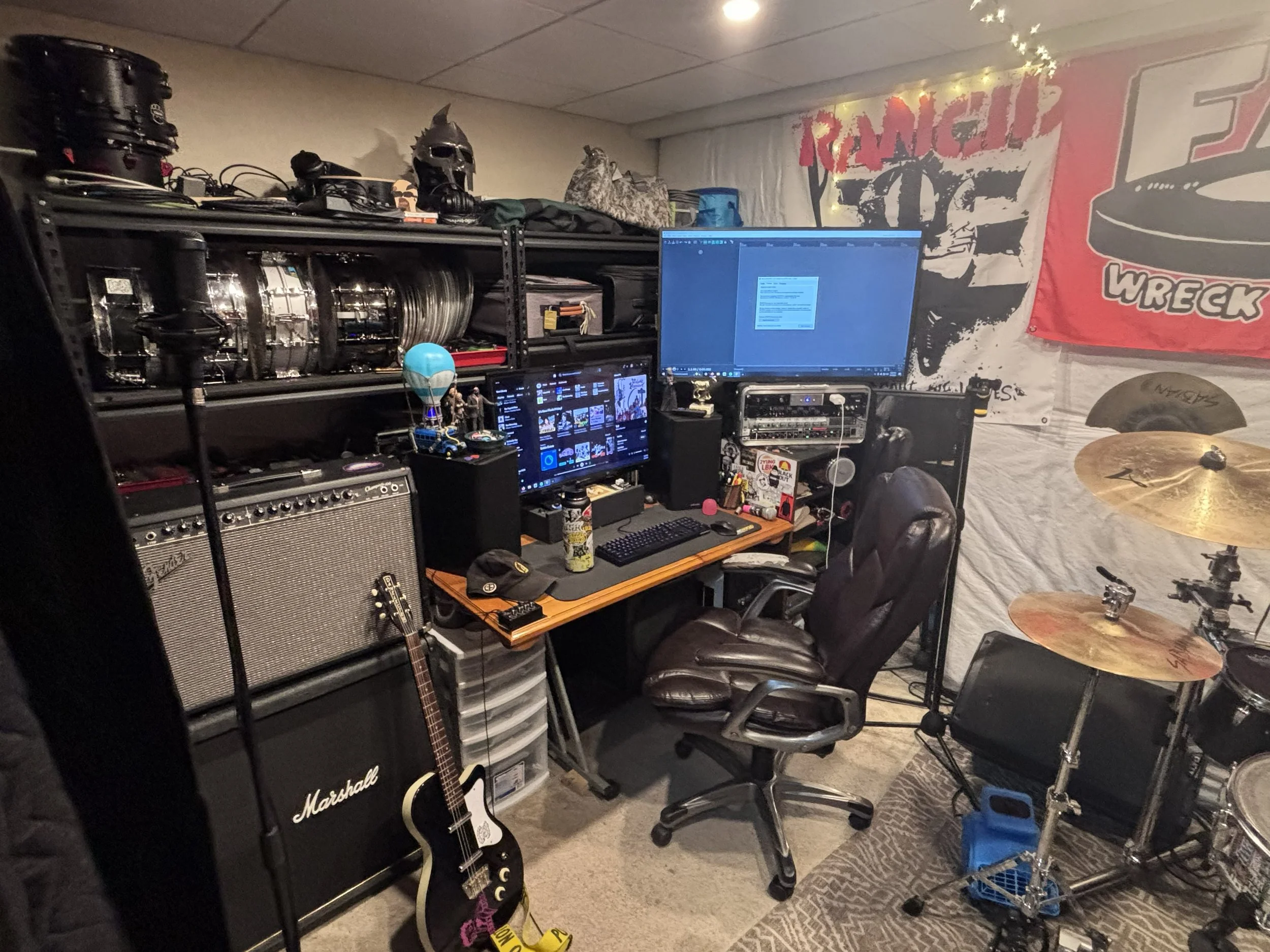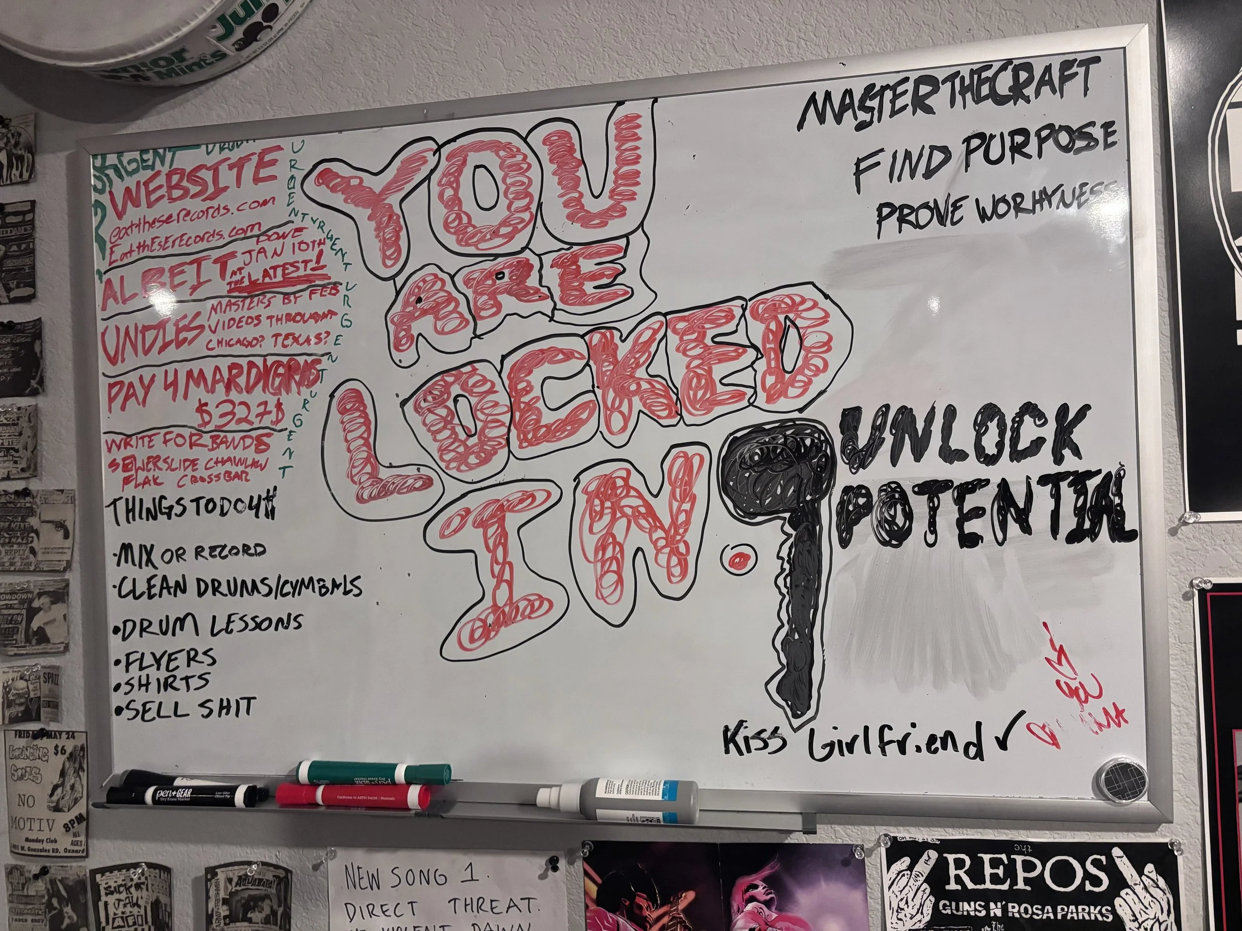 What’s the setup and on my whiteboard? The room right now, is where it has been for the past two years. Based in my Grandparents (bless them), basements’ storage room lies Eat These Records, where I record videos, albums and am typing this now. The room is somewhat treated, but by no means soundproof. There’s a lot of stuff in a tiny space, as you will see in the attached photos. I’ll do one of the studio, and one of my whiteboard. Right now, my whiteboard is a mess. It has reminders and “inspiration” but it becomes one with the wall, as all of my walls are fully covered with flyers, album inserts, framed posters and much more shit. None of the goals I set are actually acheived, but more wishful thinking. It will happen in due time. Honestly everything could be upgraded but by no means is it very bad, but money is needed first. I don’t want to sell out to the man but I fear it has to happen.